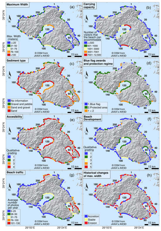 Geographical distribution of the selected indicators in Lesvos: (a) maximum width (in m); (b) carrying capacity (no of visitors); (c) sediment type (3 classes); (d) ‘blue flag’ awards and protected areas; (e) accessibility, grading from 1 (access only by sea) to 4 (easy access through the main road network); (f) beach development, grading from 1 (none) to 5 (intense, i.e., many umbrellas, watersports, lifeguarding); (g) beach ‘traffic’ due to visitation (average no of photos/year uploaded on Flickr for the years 2005–2022); and (h) historical changes in BMW.