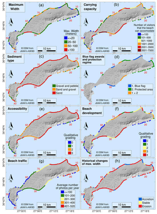 Geo-spatial distribution of the selected environmental and socio-economic indicators in Kos: (a) beach maximum width—BMW; (b) carrying capacity; (c) sediment type; (d) Blue Flag awards and protection regime; (e) accessibility (grading from 1: only access by sea to 4: easy access to the main road network); (f) beach development (grading from 1: none to 5: intense, e.g., many umbrellas, watersports, lifeguarding); (g) beach ‘traffic’ due to visitation (average no of photos/year uploaded on Flickr for the years 2005–2022); and (h) historical changes in the BMW.
