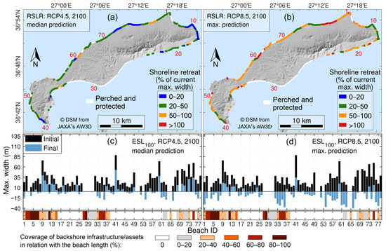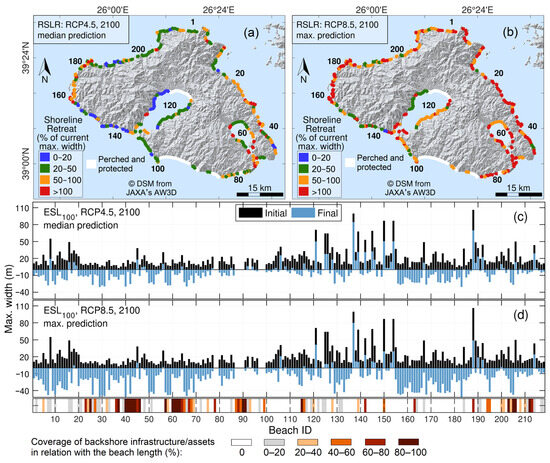 Erosion/retreat projections for the Lesvos beaches in relation to their maximum recorded widths—BMWs under RSLR by 2100, based on (a) RCP4.5 (median estimates), and (b) RCP8.5 (max. estimates). Beach widths projected for 2100 under the 1–100 year extreme sea levels—ESL100 (blue bars) are shown in relation to the current BMWs (black bars) under (c) RCP4.5 (median estimates), and (d) RCP8.5 (max. estimates). Negative values indicate complete (temporary) erosion of the beach, indicating damages to the backshore infrastructure/assets, the coverage of which along the beach backshore is shown as a percentage of the beach backshore length (Indicator 9). Note: There are no projections for ‘perched’ beaches and beaches with coastal defences.