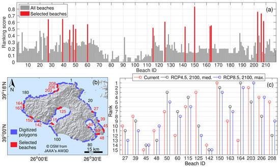 (a) Ranking scores of the Lesvos beaches (TOPSIS method) according to their socio-economic and environmental significance; the 15 most highly ranked beaches are shown in red; (b) digitized polygons of the beaches (clockwise beach numbering starting from the north) and selected beaches; (c) ranking scores of the 15 selected beaches (PROMETHEE II method) based on their vulnerability to CV and C (under current and future conditions). Note: ‘perched’ and protected beaches are not included in the analysis.