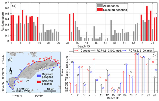 (a) Ranking scores of the Kos beaches (TOPSIS method) according to their socio-economic and environmental significance; the 15 most highly ranked beaches are shown in red; (b) digitized polygons of the beaches (clockwise beach numbering starting from the north) and selected beaches; (c) ranking scores of the 15 selected beaches (PROMETHEE II method) based on their vulnerability to CV and C (under current and future conditions). Note: ‘perched’ and protected beaches are not included in the analysis.