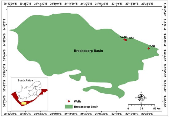 This study used three wells, namely, F-A10, F-A13, and F-O2, in the Bredasdorp Basin, offshore South Africa (Figure 1). The basin is located off the south coast of South Africa, between south-east Cape Town and the south-west of Gqeberha. The Bredasdorp Basin is approximately 200 km long and 90 km wide, occupying about 18,000 km2 below the Indian Ocean [10].