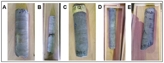 Core photographs of F-A10 at different depths. (A) Medium-grained, glauconitic sandstone with visible quartz, feldspar, and lithic fragments grains at a depth of 2719.37 m. (B) At the top of the core (2724.62 m), the light-grey colored sandstone is medium-grained with visible quartz, feldspar, and glauconite grain; it became fine-grained as the depth increased (from 2724.85 m). (C) Very fine-grained sandstone between 2733.12–2733.40 m. (D) Very fine-grained sandstone with visible lithic fragments from 2757.57–2758.03 m. (E) Claystone at 2770.80–2771.13 m with evidence of moderate bioturbation.