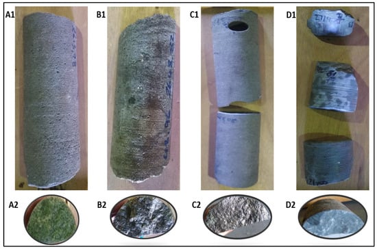 Core photographs of F-A13 at different depths. (A1) Shows a glauconitic medium-grained sandstone with visible pore spaces. (B1) Medium-grained sandstone with visible glauconite, feldspar, and quartz. (C1) Sandstone texture that changed from medium-grained to fine-grained as the depth increased. The color of the core changed with increasing depth from light grey to dark grey. (D1) A claystone. (A2–D2) Are the side views of the core samples.