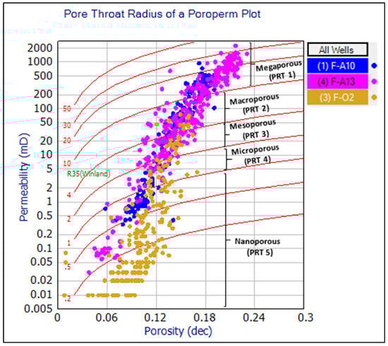 Generally, this Basin’s upper shallow marine sandstone reservoirs (Baremian to Valaginian) contain good intergranular porosity and permeability. Table 6 presents the reservoir properties calculated for each flow unit identified by SMLP and ISMLP. The rock type description (megaporous-nanoporous) used the classification outlined in Table 1. The results of the pore throat radius and petrophysical rock types identified five types of rocks (PRT1-PRT5), with PRT 1 having the most favorable fluid flow conditions (Table 5) due to their high porosity and permeability, which is consistent with the characteristics of the upper shallow marine sandstones documented by [14,19,28]. The PRT1 result is further supported by the megaporous pore radius (Table 6), resulting in PRT1 contributing the highest to the flow (Table 5). Contrastingly, the low r35 in PRT 4 and PRT 5 represented lower pore throat radii and poor fluid flow conditions, making them impervious rock intervals where fluid does not easily flow through. This phenomenon was largely observed in F-O2, whereby seven out of nine flow units showed micro and nanoporous radii. (Table 6), each contributing less than 10% flow (Table 5). The reservoir quality declined from the top left (dominated by high permeability) to the bottom right (dominated by low permeability) in Figure 5, with PRT5 having the lowest pore throat radius of less than 1 µm across the wells. Flow unit one in F-A10 and F-A13 and flow unit three in F-A10 recorded a permeability of over 200 mD and were described as megaporous (Table 6). These higher permeability intervals are consistent with those observed by [9,10,28,37] and are typical of shallow marine sandstone reservoirs in this basin. The pore throat radius had a more significant influence on permeability, contributing considerably to reservoir quality and fluid flow.