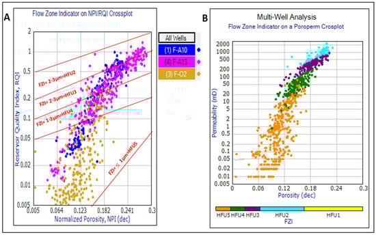 (A) The computed FZI utilized to distinguish various HFUs from an RQI vs. NPI multi-well plot. (B) A cross plot of permeability vs. porosity displaying various hydraulic flow units.