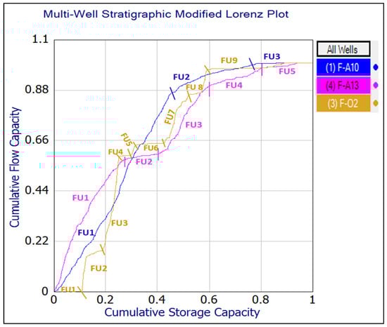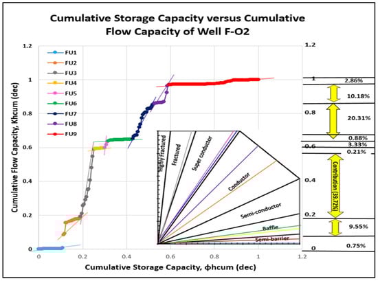 The SMLP method relied on core porosity and permeability data that have been standardized and multiplied by the respective bed thicknesses (using Equations (6) and (8)) to create a graph that can be utilized to evaluate storage and flow capacities. The cumulative flow capacity was presented on the y-axis and the cumulative storage capacity on the x-axis.