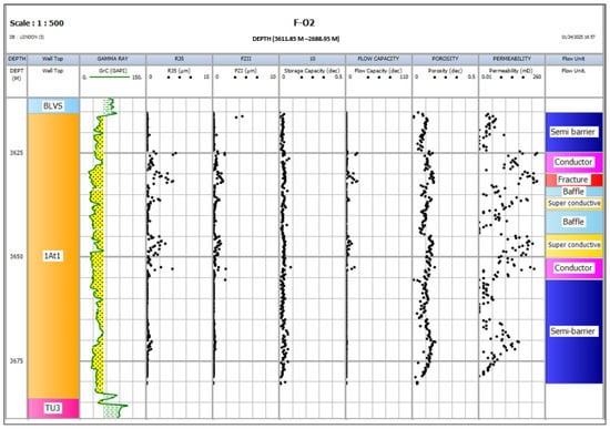 Two different techniques (SMLP and ISMLP), Figure 7 and Figure 8, were used to demarcate the reservoir intervals into flow units based on their petrophysical properties. The ISMLP results were more accurate than the SMLP results, which agrees with the results observed by [12]. The difference between the ISMLP and SMLP results was that the SMLP method uses the average petrophysical parameters to estimate the type of flow units. In contrast, the ISMLP uses the efficiency and input of each flow unit to the total flow capacity. The latter technique allowed horizontal and very steep lines/slope lines classified as moderate flow units by SMLP to be reclassified as baffle units by ISMLP. Moreover, very steep slopes classified as moderate flow units by SMLP were reclassified as super-conductive flow units by ISLMP. For example, in F-O2, FU2 had a very steep slope segment characterized as a moderate flow unit on the SMLP but a super-conductive flow unit by the ISMLP (Figure 8).
