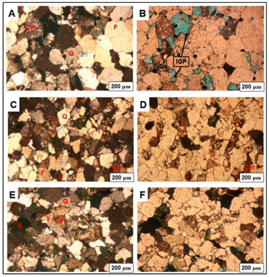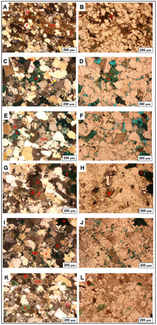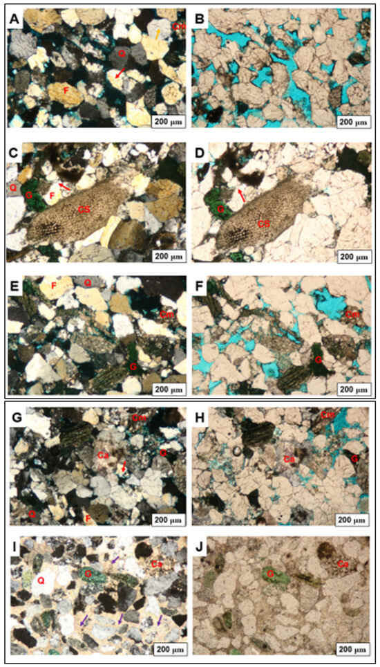 Thin section photomicrograph of F-A13 under cross-polarized light (images on the left) and plain polarized light (images on the right). Q = Quartz; F = Felspar; Felspar overgrowth (red arrow); G = Glauconite; Cm = Clay minerals; Ca = Calcite cementation (Purple arrow); CS = Calcareous Sponge. The figures on the right (B,D,F,H,J) represent plane-polarized light, and those on the left (A,C,E,G,I) represent crossed-polarized light.