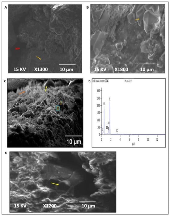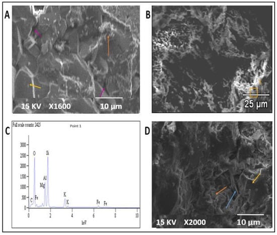 FU3 (2665.08 m): Quartz and feldspar were the main detrital minerals observed in flow unit three (Figure 13E,F). The diagenetic minerals observed were feldspar overgrowth, glauconite (Figure 13E,F), and smectite (Figure 14C). The EDX results confirmed the presence of quartz, mainly composed of silica and oxygen (Figure 14D). Intergranular pores were indicated in FU3 by the light blue color.