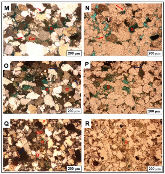 Thin section photomicrograph of F-O2. Q = Quartz; Quartz overgrowth (yellow arrow) F = Felspar; Feldspar overgrowth (red arrow); G = Glauconite; Cm = Clay minerals; Si = Siderite (blue arrow); Lf = Lithic fragment. The figures on the right (B,D,F,H,J,L,N,P,R) represent plane-polarized light, and those on the left (A,C,E,G,I,K,M,O,Q) represent crossed-polarized light.