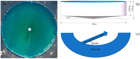 (a) The photograph of the land-based circular aquaculture tank, (b) schematic diagram showing the dimension of the tank, and (c) schematic diagram illustrating the definition of the deployment angle of the pusher.