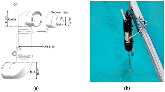 - In the fishless condition of the aquaculture tank, the diameter of the pusher was reduced from 11 cm to 7.5 cm using a variable diameter PVC adapter to study its effect on the tank’s performance at different deployment angles θ and the number of different water pusher deployments n.