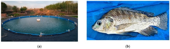 The target species of this experiment was Nile tilapia. Nile tilapia’s rapid growth, high density adaptability, efficient feed use, disease resistance, and market demand make it ideal for land-based circular tank aquaculture. It is commonly used in recirculating aquaculture (Figure 3), with a population of over 1000 individuals, an average body length of (30 ± 5) cm, and an average mass of (800 ± 50) g. The tilapia was fed standard sinking feed upon entering the tank, and the dissolved oxygen concentration in the tank was maintained above 4.0 mg/L. The tilapia was temporarily reared at ambient temperature for one month during the summer before the experiment commenced.