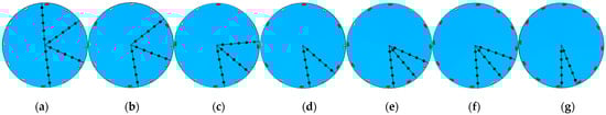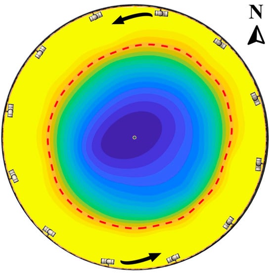 Considering the extensive work required for measuring overall flow velocity in a large land-based circular tank, this test simplifies the measurement process. For the condition with n = 2 deployments, flow velocity measurements were conducted uniformly across half of the surface area of the tank in four measurement lines, with a total of 20 points. The flow field distribution of the entire circular tank was then obtained through data fitting (the distribution of measurement points under different deployment conditions is shown in Figure 5). The steps are as follows:
