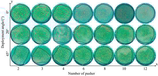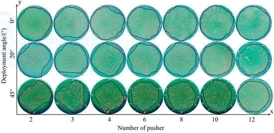 In Figure 7, it can be observed that when the pusher was deployed in the tank with a diameter of 7.5 cm, the range of motion of the simulated fish feed on the water surface increased gradually with the number of different water pusher deployments n. At the deployment angle of θ = 0°, the increase in the number of pusher deployments n had little effect on the range of motion of the simulated feed. The range of motion of the simulated fish feed was significantly reduced at the deployment angle of θ = 20°, and it was further reduced at θ = 45°. The increase in the number of deployments at all deployment angles led to a larger spreading range of simulated fish feed. Compared to the pusher with a diameter of 11 cm, the pusher with a diameter of 7.5 cm moved the simulated feed slightly more effectively, but the difference was not intuitive.