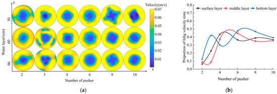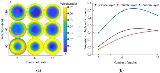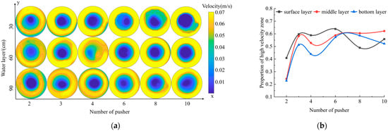 Flow field cloud map in the tanks (with fish) equipped with varying number of pushers with a deployment angle of 45° (a) and the corresponding proportion of high velocity zone (b).