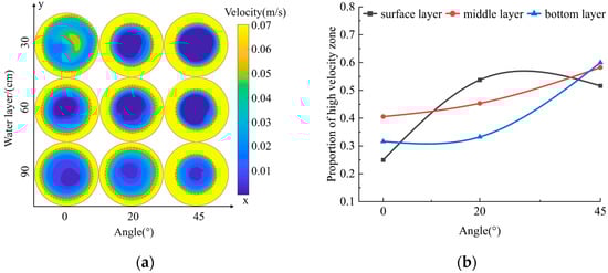Flow field cloud map in the tanks (with fish) equipped with varying deployment angles with the number of pushers 12 (a) and the corresponding proportion of high velocity zone (b).