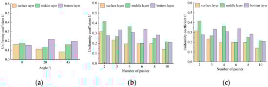 The uniformity coefficient in the aquaculture tank with varying angles with n = 12 (a), varying pusher numbers with a diameter of 11 cm (b) and varying pusher numbers with a diameter of 7.5 cm (c).
