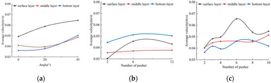 In Figure 13, it can be observed that with the gradual increase in the pusher deployment angle θ, the overall average flow velocity of each water layer in the tank gradually increased. As the deployment angle θ increased from 0° to 20°, the average flow velocity of the tank increased more slowly. When the deployment angle increased from 20° to 45°, the increase in the average flow velocity in the tank became more pronounced, with the average flow velocity in the surface layer being much higher than that in the middle and bottom layers. When the pusher diameter was 11 cm, as the number of different water pusher deployments n increased, the average flow velocity of each water layer increased only slightly. The average flow velocity in the bottom layer was the highest, reaching 0.05 m/s, and it gradually decreased from the bottom layer to the surface layer and then to the middle layer. When the pusher diameter was 7.5 cm and the deployment angle was θ = 45°, the increase in the number of different water pusher deployments n had a minimal effect on the average flow velocity in the tank. As n increased from 2 to 10, the average flow velocity of the water layers increased only slightly, remaining around 0.045 m/s. Among the layers, the highest average flow velocity of 0.065 m/s was observed in the surface layer at n = 6.