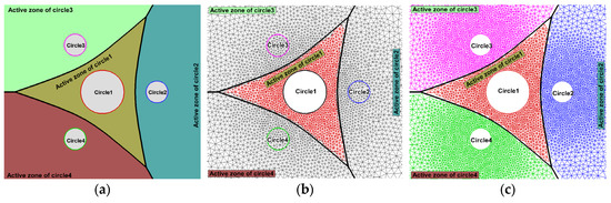 In the present overset unstructured grid method, hole cutting, the first step in overset grid assembly, is achieved by classifying the grid nodes based on a wall-distance-based criterion. As depicted in Figure 1a, the region nearest to a body is designated as its corresponding active zone, whereas the region closer to other objects is considered to be its inactive zone. When the nodes of a component grid are situated within its inactive zone, they are categorized as inactive nodes, or “hole points”. Conversely, nodes located in the active zone are classified as active nodes and are utilized in the flow field calculations. This is illustrated in Figure 1b, where the red grid nodes represent active nodes, while the black ones indicate inactive nodes. Figure 1c displays the results of hole cutting for the overset unstructured grid system, which consists of four circles, as well as the distribution of active nodes in each component grid. In the current hole-cutting method, the wall distance of the grid node is a crucial parameter for classifying grid nodes. Once the wall distances of all grid points are calculated, the hole cutting or classification of grid nodes is also completed simultaneously. To efficiently identify the active zone for hole cutting, this paper employs a parallel calculation algorithm for global minimum wall distance. This algorithm is based on the oriented-bounding-box-based kd-tree data structure of the wall surface grid, as proposed in Ref. [20].