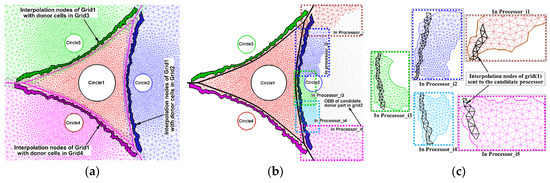 After classifying the grid nodes into active and inactive nodes, the interpolation nodes are defined as the two layers of inactive nodes next to the active nodes, see Figure 2a, which shows the double-layer interpolation boundaries of the overset unstructured grid systems illustrated in Figure 1. Their flow values are interpolated from the donor component grid, in which the interpolation points are located within its active zone. As the sub-grids have been split into parts, the position information of interpolation nodes is sent to the candidate processes, which have the partitions of the candidate donor grid with their oriented bounding boxes (OBBs) surrounding the interpolation nodes. Figure 2b,c illustrate this parallel strategy of searching the donor cell. The detail of the current parallel overset grid method can be find in Refs. [20,32].