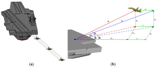 The landing approach profile for a carrier-based aircraft is illustrated in Figure 3a. The aircraft approaches the carrier on a flight path or glide slope and flies with a fixed angle of attack α with respect to the aircraft relative freestream [19]. Its pitch attitude relative to the horizon depends on the deck wind speed and the airspeed of the aircraft. The deck wind speed is the composition velocity of ship speed and wind speed. It can be regarded as a result of either the forward velocity of the ship or the wind speed blowing over a stationary ship. The airspeed of an aircraft is the relative velocity of the air flowing over the aircraft. To illustrate the calculation methods of the pitch-up attitude and approach velocity of the aircraft, a vector diagram showing the associated velocity components is presented in Figure 3b, where is the airspeed of the aircraft, is the approach velocity of the aircraft, is the deck wind speed, is the angle of airspeed relative to the horizon, is the angle of approach velocity relative to the horizon, is the angle between the projection of the airspeed vector on the horizontal plane and the deck wind velocity, and is the angle between the projection of the approach velocity vector on the horizontal plane and the deck wind velocity. The components of airspeed can be written in terms of the magnitude of the approach speed as