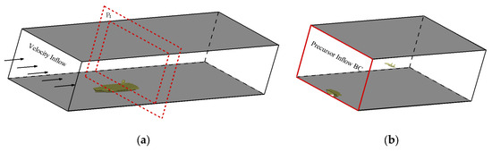 Schematic of the domain precursor inflow simulation approach. (a) The entire domain of ship air-wake simulation with a velocity inflow boundary condition; (b) the aft air-wake domain with a precursor inflow boundary condition.
