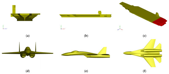 The configurations and the reference frame used in this study are illustrated in Figure 5. The complete ship model is a generic aircraft carrier model [35], with a length of 335 m and a width of 74 m. It is a “clean deck” configuration such that no aircraft or support equipment are present on the deck. The aft portion of carrier deck selected for landing simulation is shown in red in Figure 5c, and the dimensionless length, scaled by the aircraft carrier’s length, is 0.153. The carrier-based aircraft is a simplified model, with a length of 20 m, a wingspan of 12 m, and a height of 12.5 m.