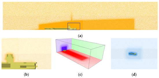 Grids for air-wake field computations and aircraft landing simulations. (a) Global distribution and (b) local detail of the grid in the entire air-wake field; (c) grid in the aft air-wake field and (d) grid of the aircraft.