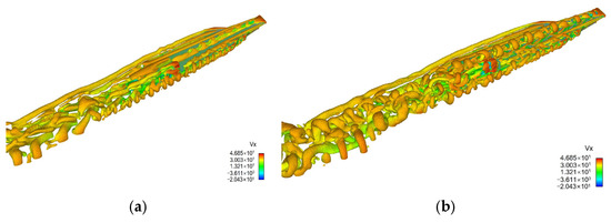 The vortex structures illustrated with the iso-surface of the Q-criterion: (a) result of RANS; (b) result of the DDES-based LES-RANS hybrid method.
