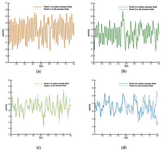 The CFD solver and dynamic overset grid method have been well validated, and results can be found in [20,22,37]. To elucidate the differences between the results obtained using the DDES method and the RANS method, the ship air-wake was computed under identical conditions with both methods. The vortex structures of different methods illustrated with the iso-surface of the Q-criterion [38] are shown in Figure 7, and it can be observed that the DDES method exhibits a superior capability to capture multi-scale flow structures. Nevertheless, validation for the domain precursor inflow approach is given here. The unsteady air-wake fields of the carrier from 40 s are computed on the grids of the entire domain and aft domain with the precursor inflow boundary condition, respectively. As shown in Figure 8, four probe points are selected to compare the consistency of the results obtained by the two methods. The dimensionless distances from these four probe points to the precursor inflow boundary surface, scaled by the length of carrier, are 0.0597, 0.149, 0.448, and 1.045, respectively.