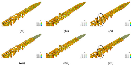 The instantaneous iso-surface of the Q-criterion at (a) 44 s, (b) 48 s, and (c) 52 s calculated by using (i) the entire domain simulation method and (ii) the domain precursor inflow method.