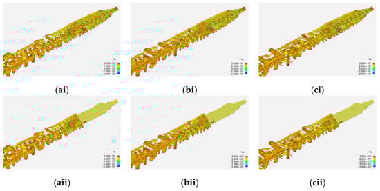 The instantaneous vortex structures realized by displaying the iso-surface of the Q-criterion at (a) 50 s, (b) 60 s, and (c) 70 s calculated by using (i) the entire domain simulation method and (ii) the domain precursor inflow method.