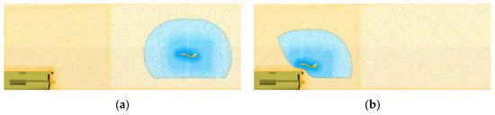 In Figure 11, the aerodynamic coefficients computed with entire air-wake domain simulation are denoted as “EFS”, in contrast to the “DPIS” coefficients. It can be seen that the two results are completely consistent with each other. The comparison of several instantaneous flow fields during the landing process is shown in Figure 12; it is difficult to see the difference between the results obtained by the two methods from the vortex structures around the carrier-based aircraft. Figure 13 illustrates the assembly results of overset grid when the carrier-based aircraft reaches two different positions during the landing. It can be seen that the hole-cutting of the overset grid is reasonable. The sub-grids of the aircraft and the carrier have comparable scales near the interpolation boundary, which can guarantee the interpolation accuracy.