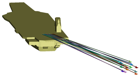 The positions of the aircraft’s center of mass for all the landing simulations are presented in Figure 15, as a function of time. Due to different landing trajectories and starting positions, the position of the aircraft relative to the carrier is different at the same time for different landing simulations. For a better reading, the aerodynamic loads are shown as functions of the centroid coordinates of carrier-based aircraft in the following.