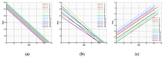 The positions of the aircraft’s center of mass during landings. (a) Longitudinal coordination varying with time, (b) vertical coordination varying with time, and (c) lateral coordination varying with time.