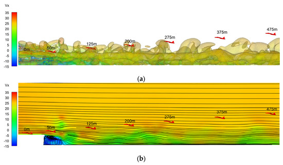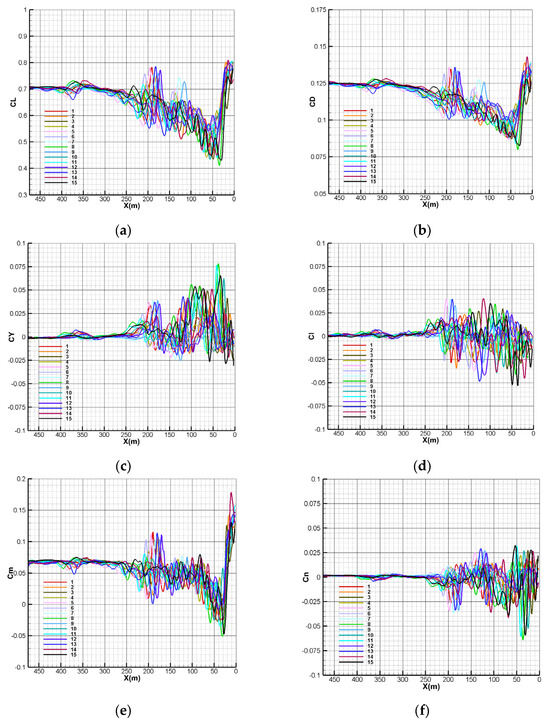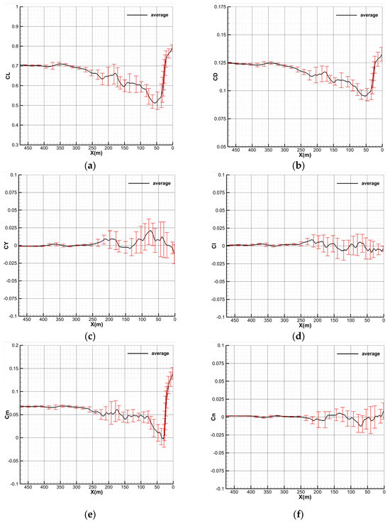 As the initial flow field around the aircraft is calculated by a steady simulation, there will be an adjustment process between the aircraft flow field and ship air-wake field at the beginning of the coupling calculation. The adjustment process of the coupled flow field would cause a certain change in the aerodynamic force in the initial stage of the landing simulation. Therefore, Figure 16 presents the lift coefficient , drag coefficient , lateral force coefficient , rolling moment coefficient , pitching moment coefficient , and yawing moment coefficient as functions of longitudinal coordination of the aircraft from X = 480 m, and Figure 17 provides the standard deviation of these coefficient values as a function of longitudinal distance to illustrate the uncertainty associated with these coefficients. In the subsequent landing process, the aerodynamic forces and moments have different variabilities along the longitudinal position, and the standard deviation of different coefficients is relatively small. Prior to 400 m from the landing point, across all carrier landing trajectories, the aerodynamic loads experienced by the carrier-based aircraft vary minimally with its longitudinal position relative to the carrier. As illustrated in Figure 18, the aircraft is located above the vortex structures of the air-wake field within this range, and the streamline at the location of the aircraft is approximately a straight line. From the simulated flow field of the landing process shown in Figure 19a, it can be further observed that there is no mutual interference between the aircraft flow field and the aircraft carrier wake flow field within this position range. Analysis of the air-wake flow field illustrated in Figure 18 and Figure 19 indicates that the aircraft has not yet entered the carrier’s wake flow field at this stage.