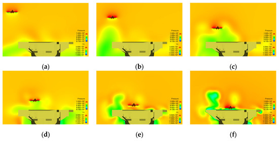 The coupled flow field of the carrier’s air-wake and the aircraft field when the distance between the carrier-based aircraft and the landing point is (a) 475 m, (b) 375 m, (c) 200 m, (d) 125 m, (e) 50 m, and (f) 0 m.