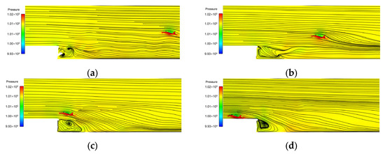 The distributions of the pressure and streamline in the vertical plane for the carrier-based aircraft at the longitudinal positions of (a) 200 m, (b) 125 m, (c) 50 m, and (d) 0 m.
