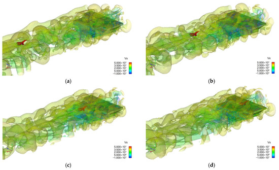 The instantaneous vortex structure illustrated with the iso-surface of the Q-criterion around the carrier-based aircraft at the longitudinal positions of (a) 200 m, (b) 125 m, (c) 50 m, and (d) 0 m.