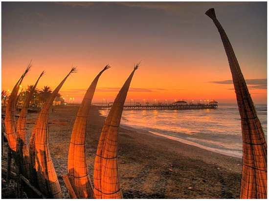 Peru has a very diverse geography, recognized worldwide, where three large areas can be classified: coast, sierra, and jungle. The majority of the population is concentrated in the coastal area, where the cities of Trujillo, Chiclayo, and the capital Lima stand out. Around 11 million inhabitants live in the latter, corresponding to a third of the total population. It is important to mention that Peru’s ecosystems are diverse, with the desert in the coastal area, the Andes mountain range in the sierra area, and the Amazon in the jungle area [1]. It is in the coastal area, in the middle of the desert, where the inhabitants of the aforementioned cities carry out their daily activities, generating water stress in the watersheds. For example, Huanchaco Beach, located in a coastal environment close to Trujillo city, suffers the negative effects of climate change and water stress of watersheds (Figure 1).