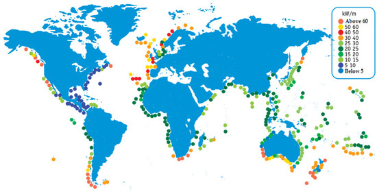 According to a scientific study on global wave potential, the coasts of Peru have, on average, a renewable marine energy potential in the range of 20–25 kW/linear meter of wave in the 3000 km of coastal environments [16] (Figure 2). This represents an intermediate range of potential for the generation of electric energy through waves at a global level.