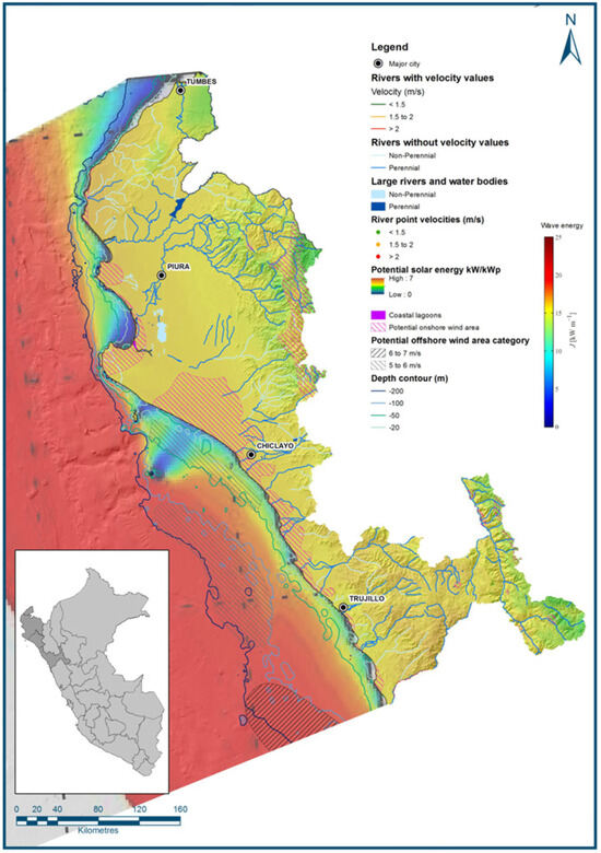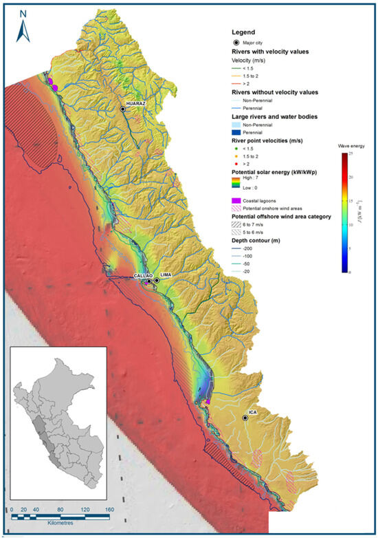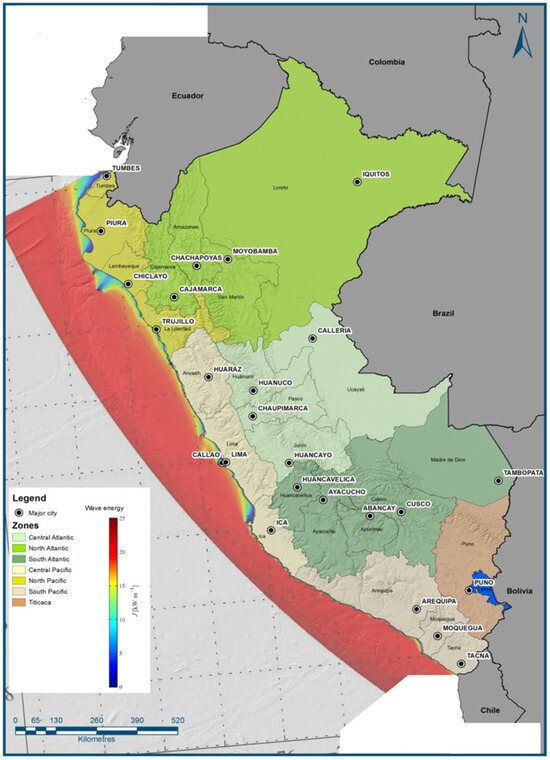 Potential of wave energy in Peru—offshore and coastal environment zones (kW/m).