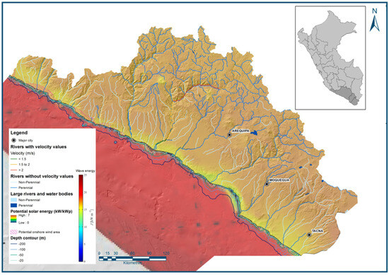 In Figure 6, it can be seen in red that the potential for marine energy from waves is of the order of 25 kW/m along the entire open sea coast of Peru [25]. A decrease in the potential for energy from waves can be seen in the bay areas, such as the Mollendo Bay and Ilo Bay sectors, but with high potential on the coasts in the rest of the territory.