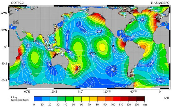 M2 is the largest tidal component (semidiurnal), whose amplitude is approximately 60% of the total tidal range. According to Figure 7 the white lines are cotidal lines, where the tides are at the same point of rise or fall, spaced in phase intervals of 30° (a little more than 1 h). According to Figure 7 the amphidromic points are the dark blue areas where the cotidal lines meet. The tides rotate around these points where little or no rise or fall of tide occurs, but where there can be strong tidal currents. In the case of Peru, the average value of M2 is a range equivalent to 20–30 cm. A typical example of the four tides in Peru per day are the following: 0.8 m, 0.2 m, 0.7 m and 0.4 m [27].