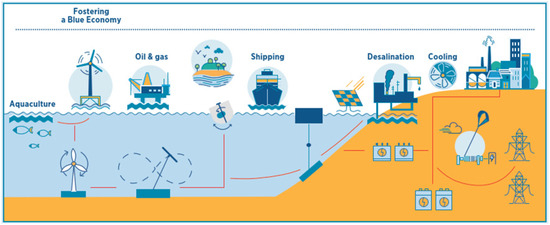 Some of the activities that can be supplied with marine renewable energy are, for example: (i) fishing, (ii) oil and gas platforms, (iii) ship transport, (iv) seaports, (v) seawater desalination plants, (vi) cooling systems, (vii) urban areas, and (viii) interconnected electricity systems [36].