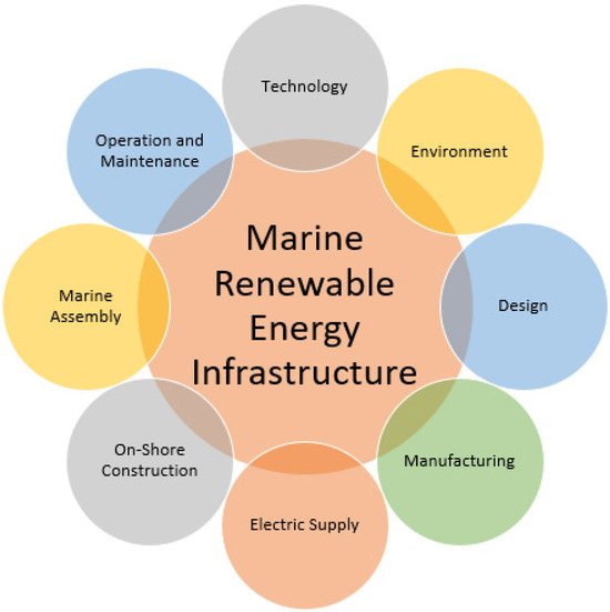 In order to achieve the insertion of marine renewable energy, it is necessary to develop eight pillars based on infrastructure (Figure 9). First, it is necessary to have the best available technologies (BATs), so that low-cost, safe, and efficient systems can be implemented. Second, it is necessary that the infrastructure and systems implemented are environmentally friendly and promote its conservation. Third, the engineering design stage of all marine energy systems and devices is key, ensuring high quality. Fourth, we have the manufacturing of parts of all infrastructure systems, which must ensure high factory quality of different components of the energy systems and devices so that they function properly and without problems. Then, fifth, we have the supply of the electrical system, where all marine systems are connected to land-based electrical systems to share clean energy. Sixth, we have the construction of infrastructure elements on the continent or land far from the sea, where interference must be minimized. Seventh is marine assembly, where the installation of marine energy electromechanical systems and devices is carried out at sea with the support of vessels. Finally, eighth is the operation and maintenance of marine renewable energy infrastructure, which will be necessary to ensure proper functioning during the useful life of the energy projects [15].