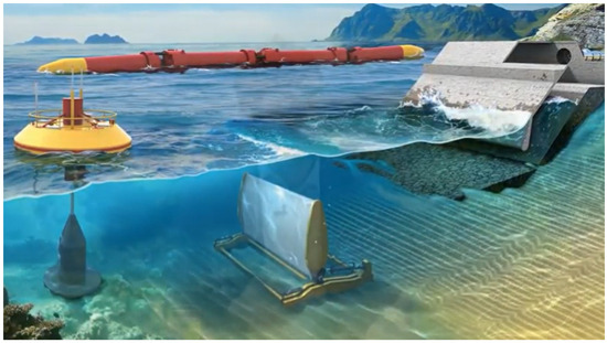 In order to supply energy to the different terrestrial systems, it is possible to obtain energy from the ocean with different devices. For example, in the sea, but close to the coast, it is possible to install solar photovoltaic panels and buoy points, the latter to obtain energy from the waves that break on the coast. In deeper areas or offshore, it is feasible to install wave energy systems using highly efficient Pelamis or oscillatory devices. Then, in even deeper areas offshore, it is possible to install tidal energy harvesting systems such as turbine and pendulum devices. All these systems can be complemented with floating wind turbines [34,35].