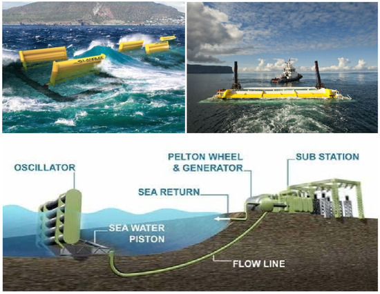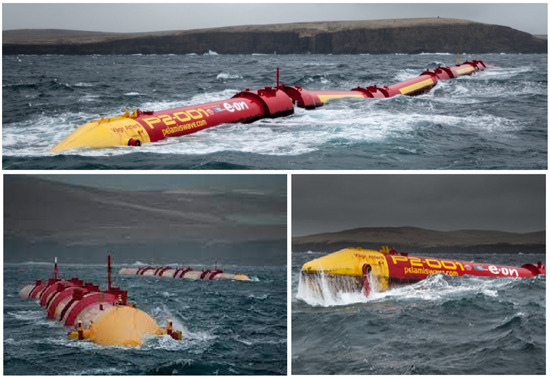 Attenuator devices are generally long floating structures aligned with the direction of the waves, which then absorb the motion. Their motion can be selectively damped to produce energy. They have a smaller area perpendicular to the waves compared to a terminator device, so the device can experience reduced forces. It uses the motion that waves confer on a body, which in turn is transmitted to a system capable of converting this mechanical energy into electrical energy (turbines or electrical converters). Figure 11 shows some representative images of this device, while Table 2 indicates the main technical specifications [33].